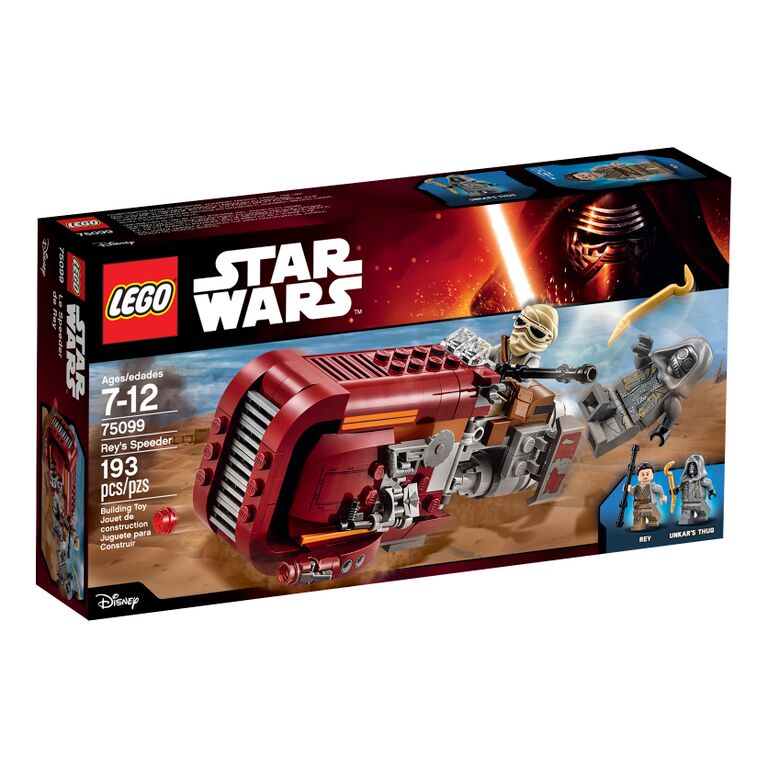 75099 – Rey’s Speeder™ Hover into action on Rey’s Speeder! This cool landspeeder has everything Rey needs for scouting the surface of a desert planet, including dual stud shooters, opening storage hatch and side-mounted bag, blaster, buzzsaw and electrobinoculars. There’s also a detachable sled with space for a minifigure when Rey must make a quick escape down the desert dunes! Recreate your own fantastic scenes from Star Wars: The Force Awakens. Includes 2 minifigures: Rey and Unkar’s Thug with a crowbar. $19.99 USD