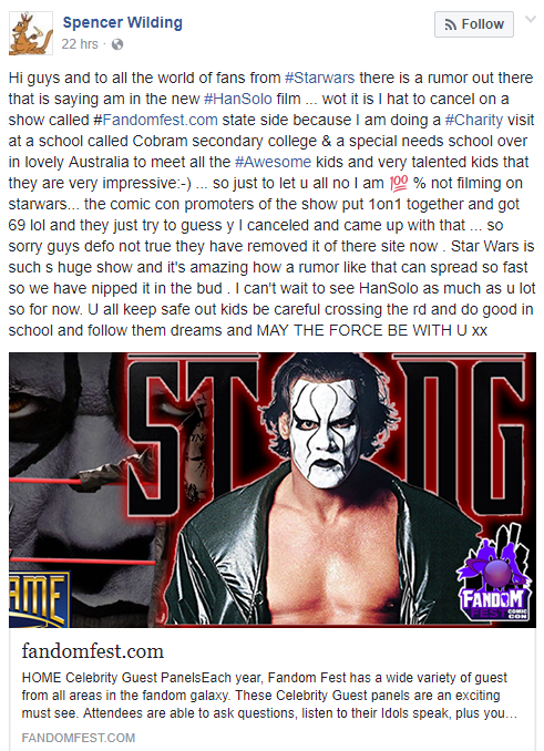 Spencer Wilding Has Not Been Cast In The New Han Solo Film Posted on July 28, 2017 by Amy Spencer Wilding posted on facebook to clear up this rumor.