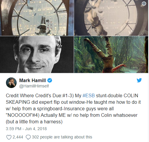 “Credit where credit’s due,” Hamill tweeted to honor Skeaping, who also worked on James Bond films and 1978’s Superman. “My #ESB stunt-double COLIN SKEAPING did expert flip out window-He taught me how to do it w/ help from a springboard-Insurance guys were all ‘NOOOOO!’ “
